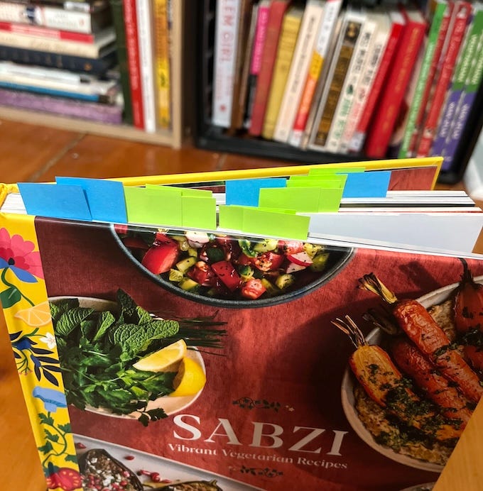 First, I’d like to present an OMG salad recipe that was recently contributed by the publisher of Sabzi: Vibrant Vegetarian Recipes by Yasmin Khan (who you can find here on Substack). I’m just crazy about this book, as you can see from all the post-its (blue is for the recipes I’ve already made; lime green for the ones that I want to try in the weeks ahead).